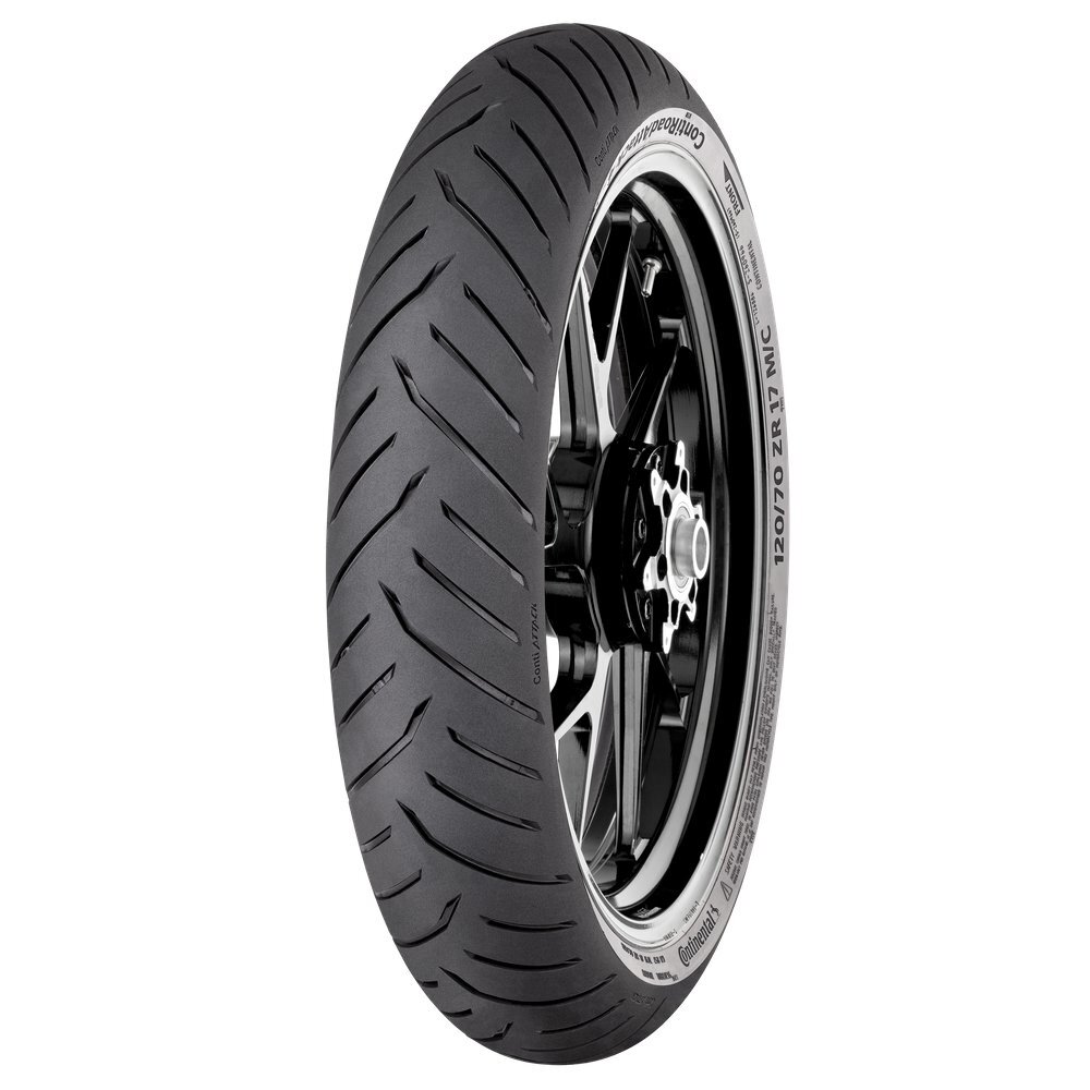 The Conti Road Attack 4 builds on the success of Continentals sport and touring motorcycle tyre ranges to create the perfect mix of both. An all new tire compound using the latest polymer and resin technology for better wear resistance and an updated tread pattern, give a massive boost to wet weather performance optimised for modern ABS and traction control systems. The inclusion of a near slick area on the upper tread shoulders allow class topping cornering grip at high lean angles. Ultra fast warm up in colder conditions for instant confidence and safety and TractionSkin for a greatly reduced break in period.