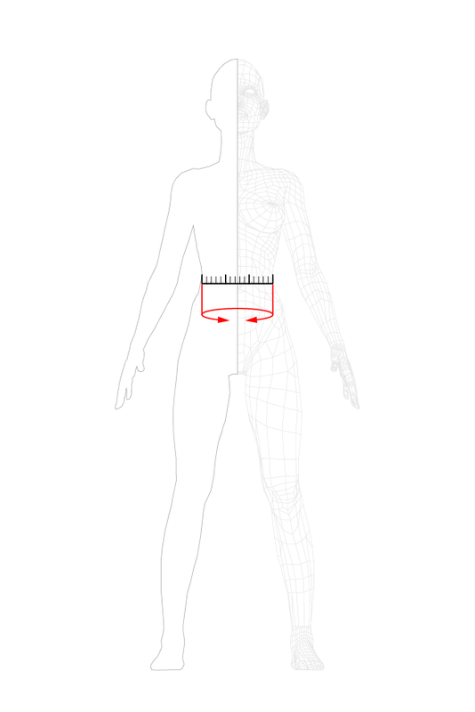The circumference of the waist is measured by passing the tape measure on the waistline between the ribs and the pelvis just above the hip bones. Take the measurement when standing upright and breathing normally with the abdomen relaxed.