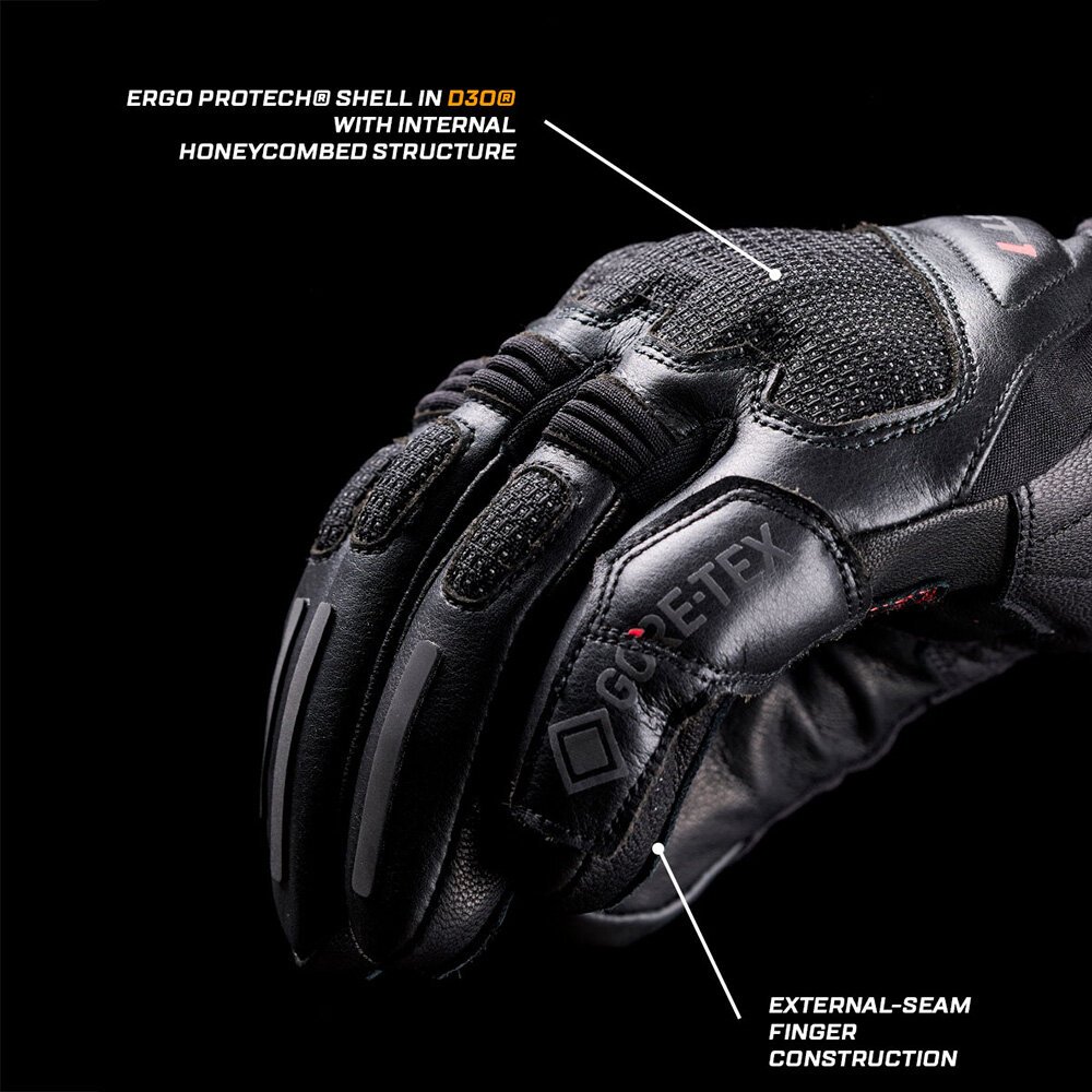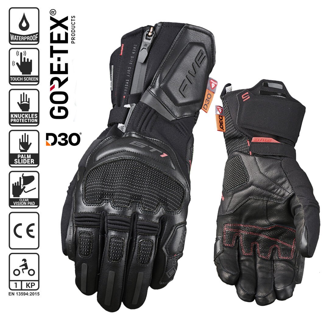 As the ultimate road touring motorcycle glove, the GT1 EVO GTX has all you need to rack up the kilometres in total comfort. Supple leather and Syntech Skin™ construction, a Gore-Tex® Grip™ membrane, and lightweight Primaloft® 80g thermal insulation provide total comfort. The GT1 EVO GTX also includes FIVE's ERGO PROTECH® protective shells - made in D3O® impact absorbing material - and an ergonomic screen wiper. FIVE have taken their innovation the extra distance with this innovative Gore-Tex® touring glove that will ride with you to the ends of the earth.