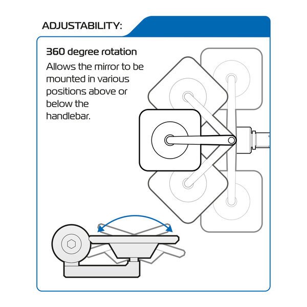 A high-quality bar end mirror machined from billet aluminium, featuring anti-glare convex glass for clear vision. Designed to fit 22mm / 7/8" handlebars, it offers full 360° rotation so you can mount it above or below the bars for your preferred setup.