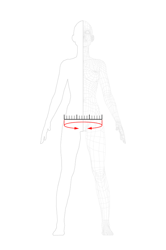 The circumference of the hips is measured horizontally around the part of the pelvis that protrudes most.