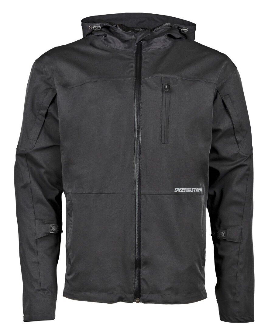 The Fame And Fortune™ motorcycle jacket from Speed and Strength® adds modern looks to modern materials to create a functional, waterproof riding jacket. The hooded outer shell is constructed from AR-900 material that is waterproof and breathable and still provides four-way stretch for rider comfort. Vault™ impact armor is included for the shoulders, elbows and back. The Fame And Fortune™ jacket uses a generous cut that is great for layering while supplying a variety of draw cord and hook and loop adjusters for a perfect fit. Speed and Strength® takes the extra step to seal out the weather with waterproof zippers and includes reflective trim and connector loops to secure the Fame And Fortune™ jacket to your riding jeans for added protection.