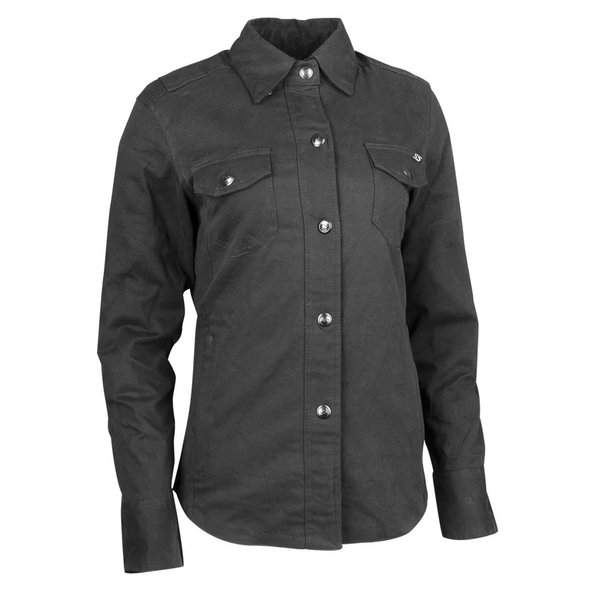 The Speed and Strength® Speed Society™ Women's Riding Shirt is a waxed cotton-polyester blend frame with 4-way stretch. Gusseted shoulders make an easy reach to high bars and clip-ons alike. Hidden snaps keep the collar controlled and prevent buffeting at high speed. A CE approved Vault™ back protector is included to match the Vault™ armour at the elbows and shoulders. Reflective trim across the width of the back panel aids visibility in low light conditions, and jacket to pants connection loops secure to your belt which will prevent the germent riding up while riding.